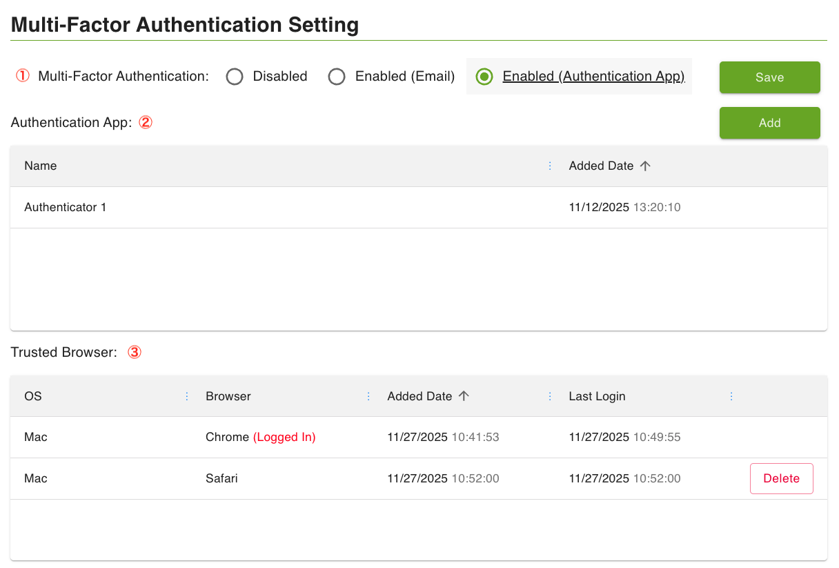 - View or delete the list of browsers registered as trusted. Multi-factor verification is skipped when logging in from a trusted browser.