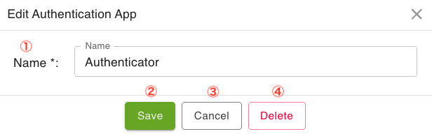 The "Edit Authentication App Window" allows you to rename or delete a registered authentication app. It is displayed when you click on a row in the authentication app list.