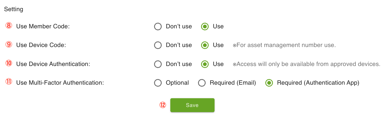 - Select Multi-Factor Authentication from "Optional", "Required (Email)", or "Required (Authentication App)".