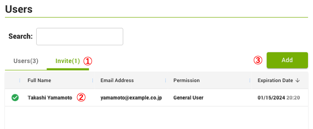 "Invitation" displays a list of users who have been sent invitations but have not yet joined the organization.